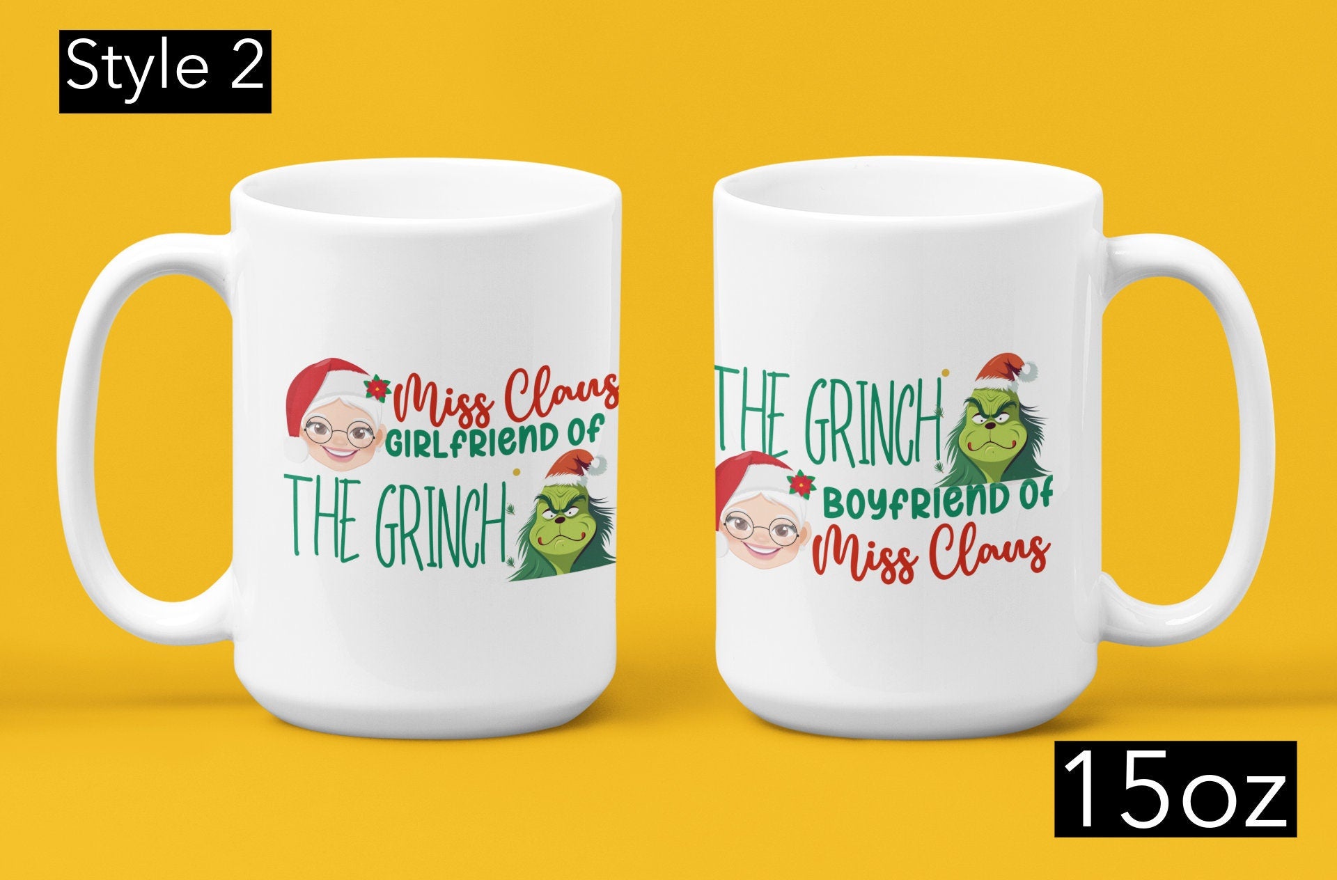 2 Piece Funny Christmas couple matching Mugs, Mr and Mrs Claus but girlfriend and boyfriend of the Grinch Trendy Xmas fiancé Grinchmas gift