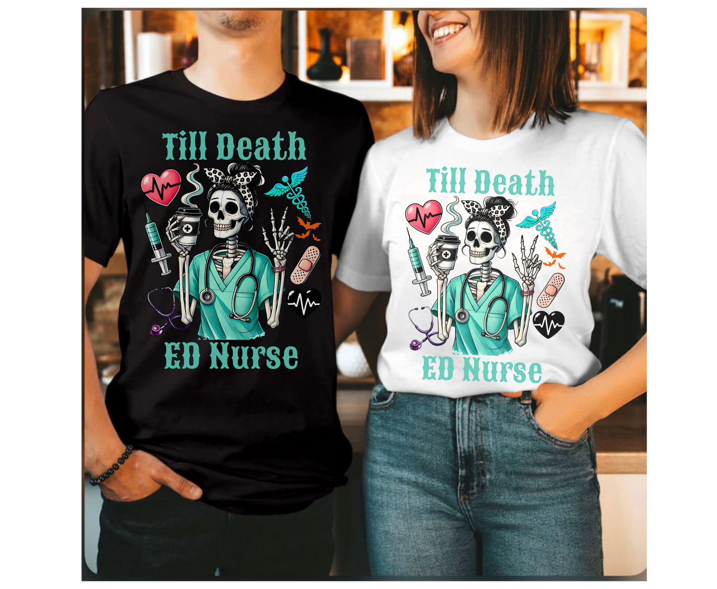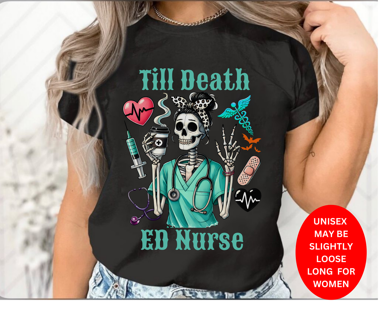 🎃👻 Spooky ED Nurse Halloween T-Shirt: Unleash the fun and frights this Halloween with our adorable and spooky Till Death Emergency Nurse T-Shirt!  surrounded by whimsical ghosts that add a touch of eerie charm. The vibrant colors and detailed illustrations make this shirt a must-have for any ER nurse looking to celebrate the season in style.👻🎃acabre, this shirt is designed to bring a spooky twist to your Halloween celebrations.